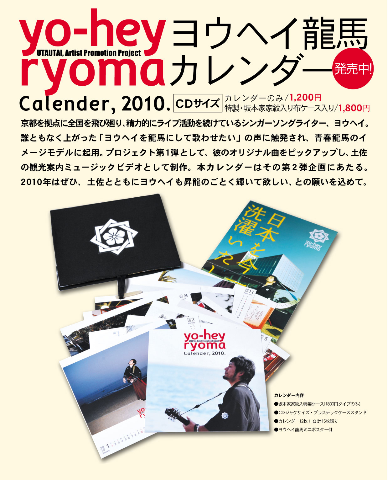 京都を拠点に全国を飛び廻り、精力的にライブ活動を続けているシンガーソングライター、ヨウヘイ。誰ともなく上がった「ヨウヘイを龍馬にして歌わせたい」の声に触発され、青春龍馬のイメージモデルに起用。プロジェクト第1弾として、彼のオリジナル曲をピックアップし、土佐の観光案内ミュージックビデオとして制作。本カレンダーはその第2弾企画にあたる。2010年はぜひ、土佐とともにヨウヘイも昇龍のごとく輝いて欲しい。との願いを込めて。